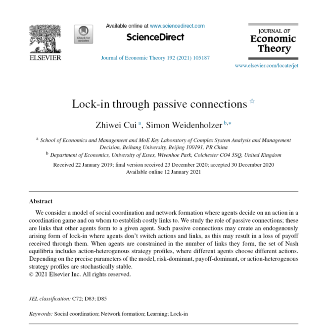 近日,我院崔志伟副教授在理论经济学顶尖期刊Journal of Economic Theory发表了题为“Lock-in through passive connections”的论文。论文合作者为英国埃塞克斯大学(University of Essex)经济学系Simon Weidenholzer教授。