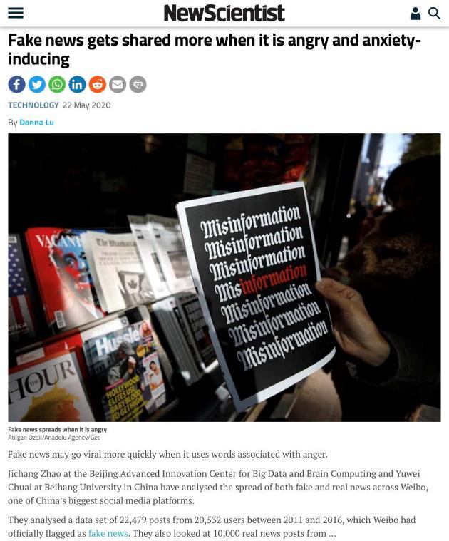 该报道可通过http://www.newscientist.com/article/2242452-fake-news-gets-shared-more-when-it-is-angry-and-anxiety-inducing/访问,相关工作论文可通过http://arxiv.org/abs/2004.10399获取。