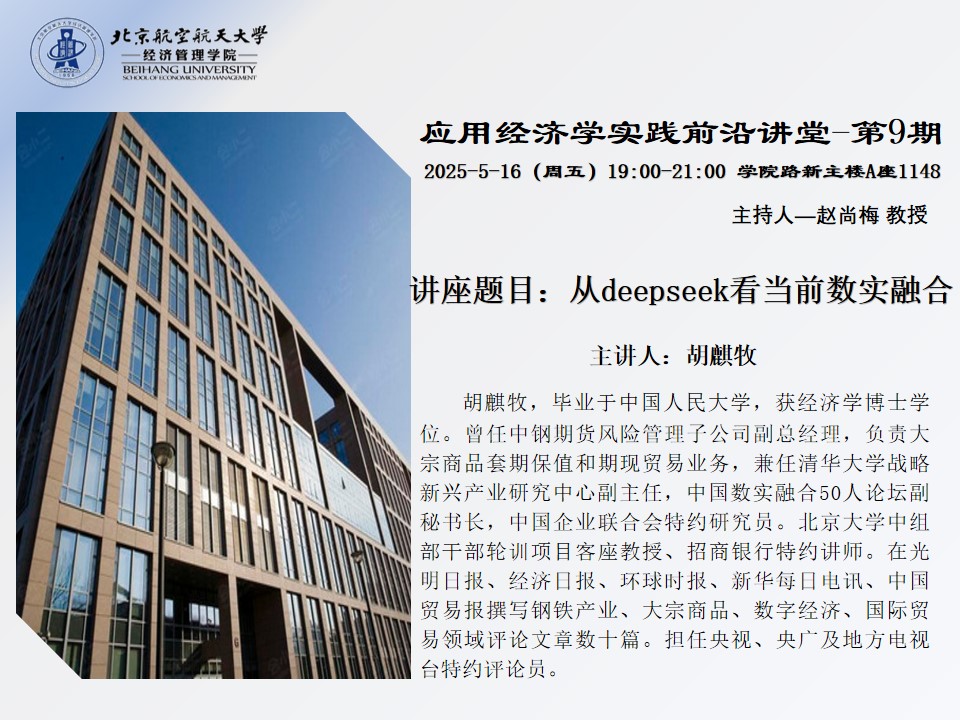2025年5月16日晚19:00-21:00,北京麻豆精品秘 国产传媒经济管理学院“应用经济学实践前沿讲堂”第9期在学院路新主楼A座1148室成功举办。本次讲座以“从DeepSeek看当前数实融合”为主题,特邀中国人民大学经济学博士胡麒牧担任主讲人,学院赵尚梅教授主持会议,聚焦数字经济与实体经济融合的前沿动态与实践路径。