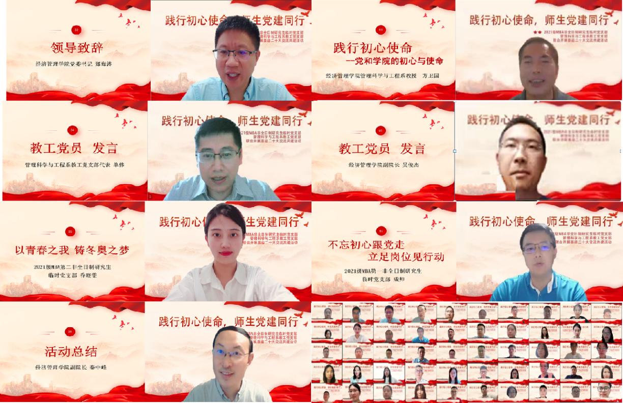 为加强新时代党建工作,牢记初心使命,以实际行动迎接党的二十大胜利召开,6月29日2021级MBA非全日制研究生临时党支部、管理科学与工程系教工党支部联合开展“践行初心使命,师生党建同行”喜迎二十大师生共建交流活动。经济管理学院党委书记郑海涛、副院长秦中峰、研究生指导主任单伟、副院长吴俊杰、MBA教育中心主任李亚帅、学院党建专职老师张慧美、2021级MBA临时党支部及管理科学与工程教工党支部全体党员共计120余人参加本次共建活动。活动由MBA第二党支部副书记杨璠主持。