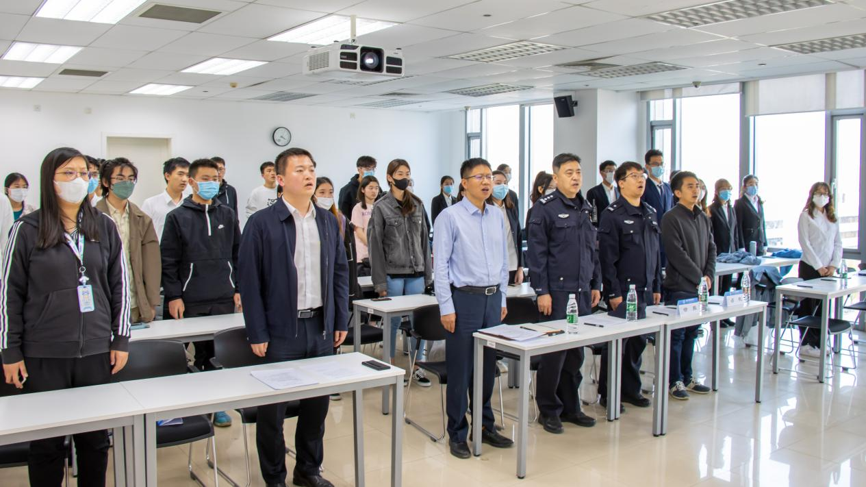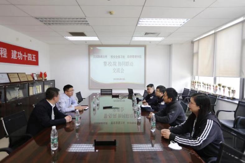会前,经济管理学院党委书记郑海涛、党委副书记高超与北京市花园路派出所副所长徐振、学校安全保卫处副处长占帆就校园金融诈骗、学生安全等工作进行交流座谈。双方围绕警-校-院协同联动机制建设充分交换了意见,并明确定期召开联席会研讨工作开展情况。郑海涛老师介绍了学院成立党员先锋队的初衷,按照习近平总书记始终把保障人民群众生命财产安全放在第一位的重要指示,发挥学生党员先锋模范作用,成立宣讲团负责防金融诈骗宣讲工作,成立志愿服务队负责学校安全体验馆讲解工作,在学习实践中提升学生安全意识。