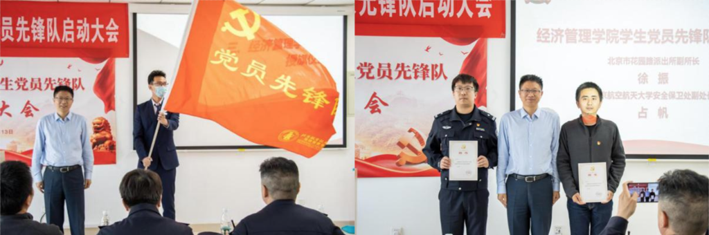 随后,郑海涛老师向学生党员先锋队负责人赵恒源授旗并为党员先锋队特聘指导教师颁发聘书。花园路派出所副所长徐振、安全保卫处副处长占帆为学生党员先锋队骨干颁发聘书。