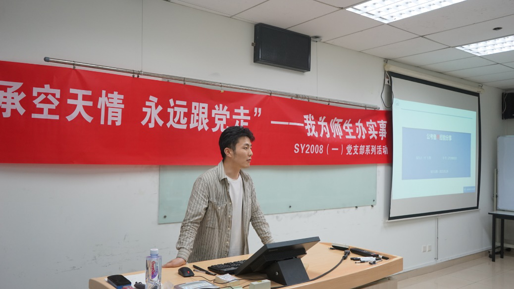 在MBA学长学姐分享过后,今年被全国人大常委会办公厅中央选调生录取的2019级硕士付飞翔学长给同学们带来了公务员及选调生的科普。他向同学们介绍了公务员和选调生的定义、公务员的待遇、报考信息等,他着重向同学们分享自己的备考过程,从笔试、面试和政审三方面详细展开,他表示备考心态很重要,学校是我们坚实的后盾,同时他鼓励有考公志向的同学们多练题。
