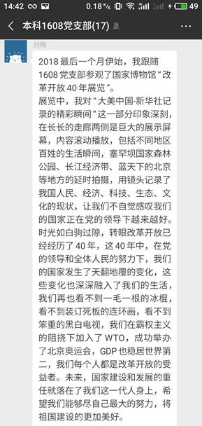 通过参观这次展览,各位党员深刻感受到了改革开放四十年以来,我们伟大祖国的巨大变化。大家表示,作为学生党员,应当不忘初心,砥砺前行,坚定理想信念,脚踏实地奋斗,努力学习专业知识,在中华民族的伟大复兴进程中贡献自己的力量。