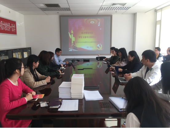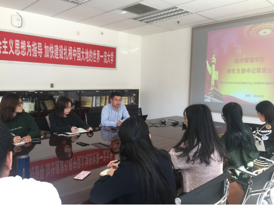20181023日在新主楼A710召开了经管学院学生党支部书记联席会,主要对“全国教育大会”的内容进行学习。会议由研究生指导主任单伟副教授主持,本科工作办辅导员白雪老师、研究生工作办辅导员张慧美老师及全体学生党支书全程参加本次会议。