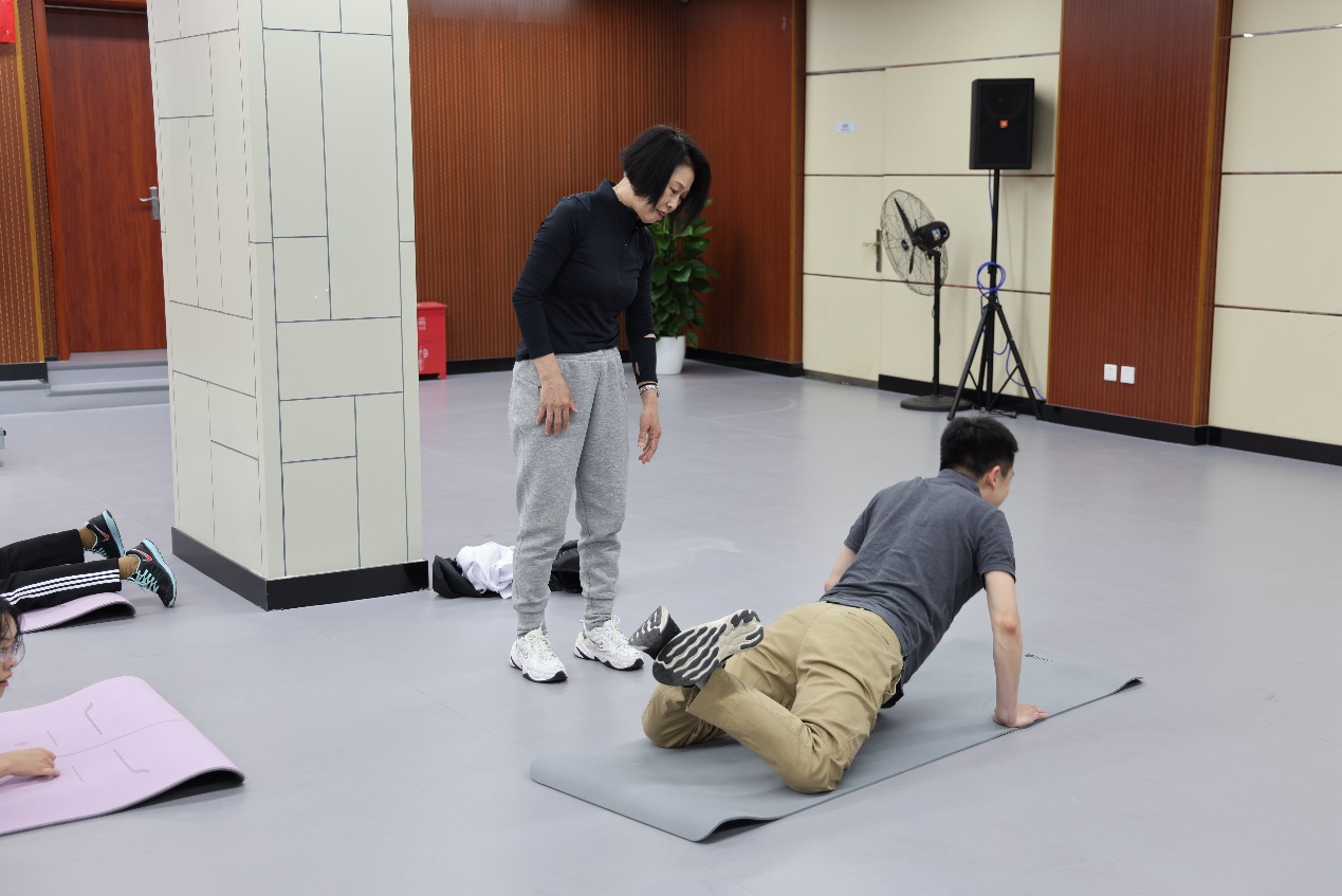 理论讲解过后,宫教授亲自带领教师们进行基础动作练习,从简单的伸展到有一定难度的力量训练,每一个动作都耐心指导。在练习过程中,针对教师们的动作,宫教授进行了针对性的指导与讲解,及时纠正错误姿势,避免运动损伤,同时分享高效燃脂训练方法,帮助大家提升运动效果。