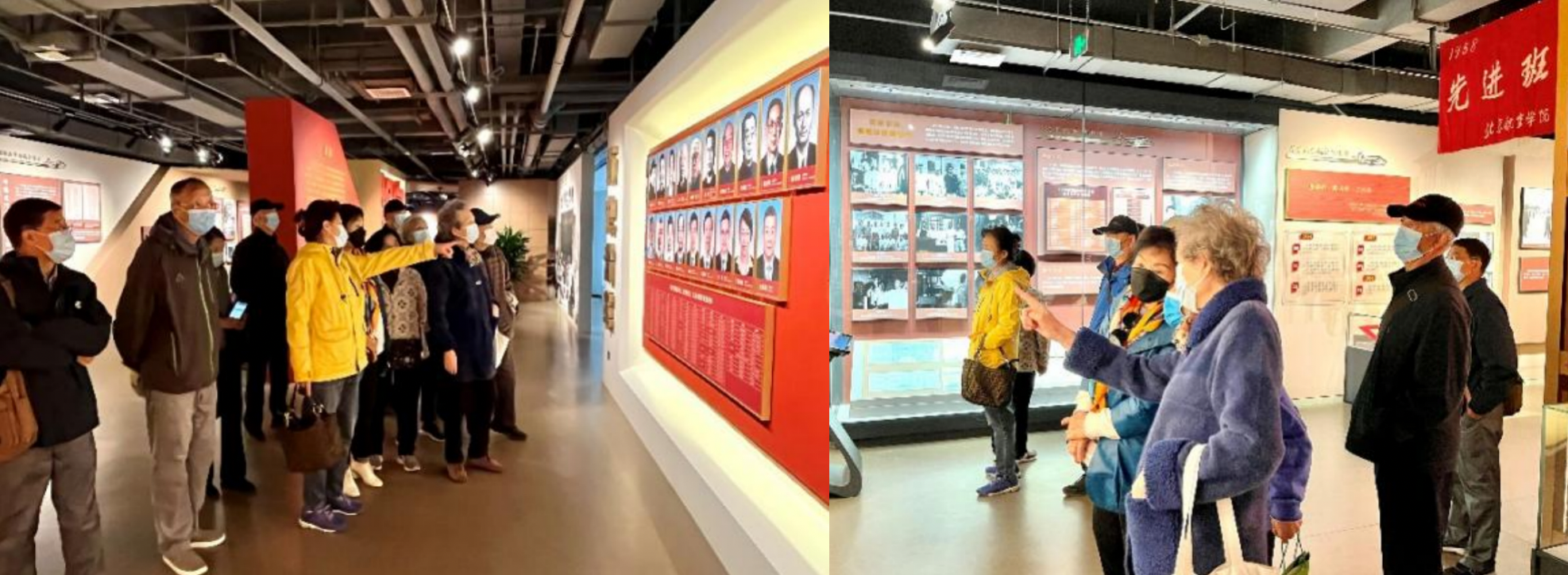 在校史讲解志愿者的带领下,大家从校史沿革图开始探索学校的发展历程,老同志们边看边听,不时停下脚步,热烈地讨论着他们曾经经历过的北航建设和发展,看到那些熟悉的老教材、老物件儿、老导师、老同事、老场景,倍感亲切、感慨万千。老党员刘新国老师观展后谈道:“参观校史展览,观物读字听讲,又一次被带入了过往岁月。一件件老教具、一面面老旗帜、一本本老教材和手稿、一幅幅当年的照片、一个个生动的造型与声响…… 再现了一代代北航人教学科研、授课学习的真实场景,透视出艰苦创业、奋斗不息的脚步,空天报国的精神。‘抚今追昔,泪且涔涔透纸背矣。’参观校史馆,激发了我们爱校爱国、弘扬北航精神的情怀!”