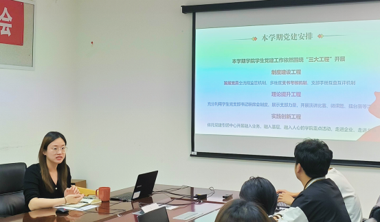 会上,陶雨芊对本学期学院学生党建工作进行工作部署。学院结合党建工作开展中的工作实际,提出“三大工程”的全新模式,着力解决党支部建设难点和实践创新难点,推动支部党建工作守正创新。依托制度建设工程,继续建立和完善发展党员全流程监管机制、多维度支书考核机制、支部手册互查互评机制;依托理论提升工程,充分利用学生党支部书记联席会制度,继续开展演讲比赛、微课题、擂台赛等活动,进一步展示支部的力量;依托实践创新工程,通过党建引领中心开展融入业务、融入基层、融入人心的学院重点活动,深入开展企业走访调研,深化服务助力乡村振兴。此外,陶雨芊就近期将开展支部手册互查互评和发展党员等重点工作做出提醒。