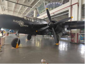 在银翼巡空展区,以地面陈列和空中悬吊两种方式展示了30余架国内外珍贵的实体飞机。张海兰副校长重点介绍了镇馆四宝之一的“黑寡妇”。“黑寡妇”是第一架美国夜间战斗机(P-61),随着历史变迁,目前在世界上仅存有两架,一架在美国的俄亥俄州空军博物馆,另一架就在航空航天博物馆。