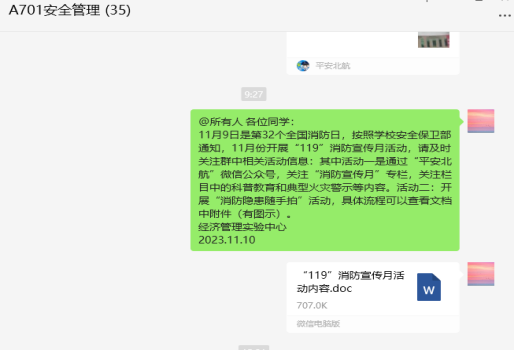 11月6日下午14点线上组织动员师生参与了消防安全专项培训,并组织师生通过“平安北航”公众号,关注“消防宣传月”专栏,开展针对性的科普教育和典型火灾警示教育。