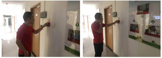 (2)疏散组老师负责实验室房间喊话通知:各位师生,学生机房A701发生火警,请大家保持镇静,按疏散线路有秩序地进行疏散,逃生时要注意用湿毛巾(湿手帕)捂住口鼻,弯着腰撤离火灾现场,往新主楼楼下紧急疏散。同时喊话的老师及时为各实验室断电,避免火情蔓延,并同时关闭通道中的隔火门预防火势蔓延。